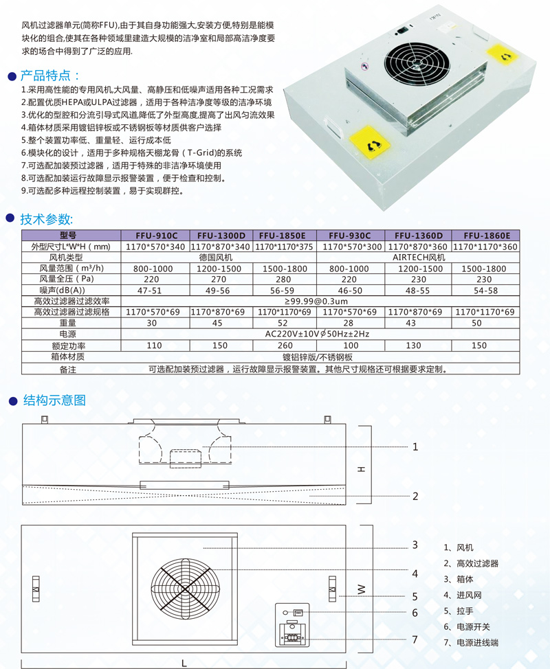 產品備注:風機過濾器單元(簡稱FFU),由于其自身功能強大,安裝方便,特別是能模塊化的組合,使其在各種領域里建造大規模的潔凈室和局部高潔凈度要求的場合中得到了廣泛的應用.