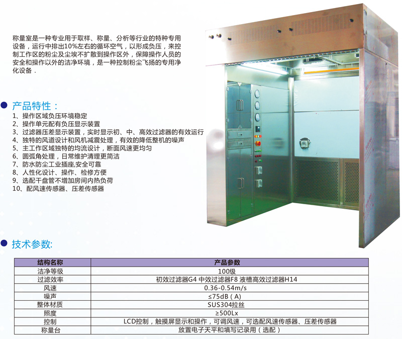產品備注:稱量室是一種專業用于取樣、稱量、分析等行業的特種專用設備,運行中排出10%左右的循環空氣,以形成負壓,來控制工作區的粉塵及塵埃不擴散到操作區外,保障操作人員的安全和操作以外的潔凈環境,是一種控制粉塵飛揚的專用凈化設備.
