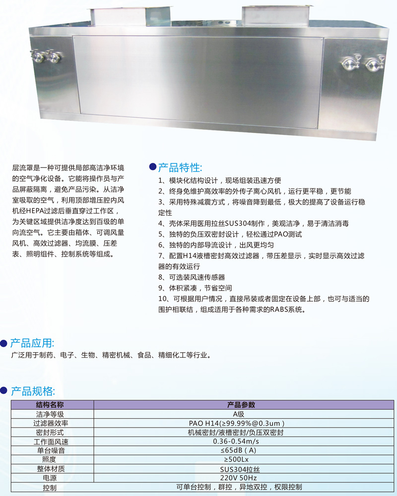 產品備注:層流罩是一種可提供局部高潔凈環境的空氣凈化設備。它能將操作員與產品屏蔽隔離,避免產品污染。從潔凈室吸取的空氣,利用頂部增壓腔內風機經HEPA過濾后垂直穿過工作區,為關鍵區域提供潔凈度達到百級的單向流空氣。它主要由箱體、可調風量風機、高效過濾器、均流膜、壓差表、照明組件、控制系統等組成。